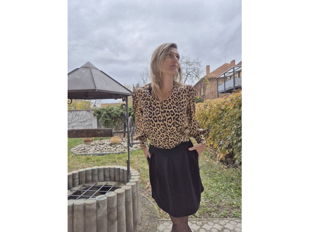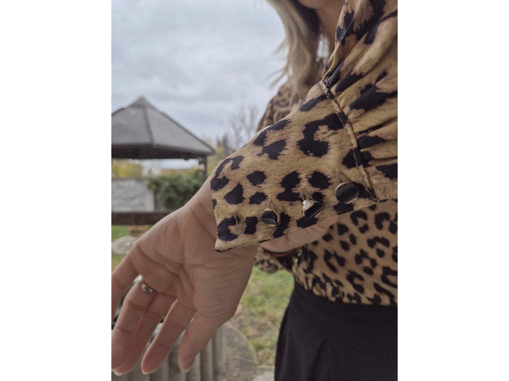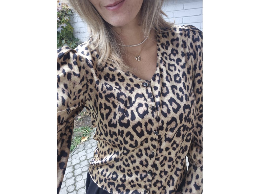Halenka s propracovanými detaily se zapínáním na knoflíčky, rukávy zakončené elegantní manžetou. Zvířecí vzor v luxusním saténu. Elegantní lesk a výrazný vzhled.